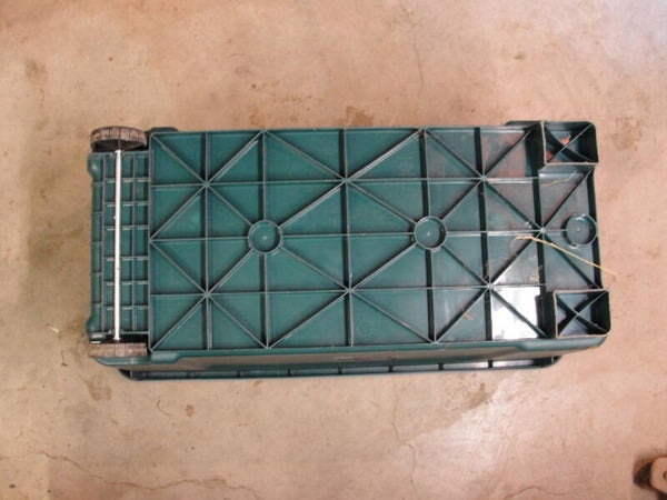 Storage Tote with wheels, 33 gallon, 38.5”L x 19.5”W x 20.5”D overall dimensions, usable inside dimension around 34” x 15” x 15”. 175 pound weight capacity. Snap down handles hold lid in place. Tote weighs about 20 pounds and is made of polypropylene.